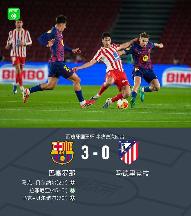 国王杯半决赛次回合,巴萨在首回合0-4的情况下主场3-0击败马克,但总比分3-4遗憾止步四强,马竞晋级决赛,将迎战皇家社会与毕尔巴鄂竞技之间的胜者。贝尔纳尔首开纪录,亚马尔助攻,佩德里造点,拉菲尼亚点射,孔德伤退,贝尔纳尔再入一球。